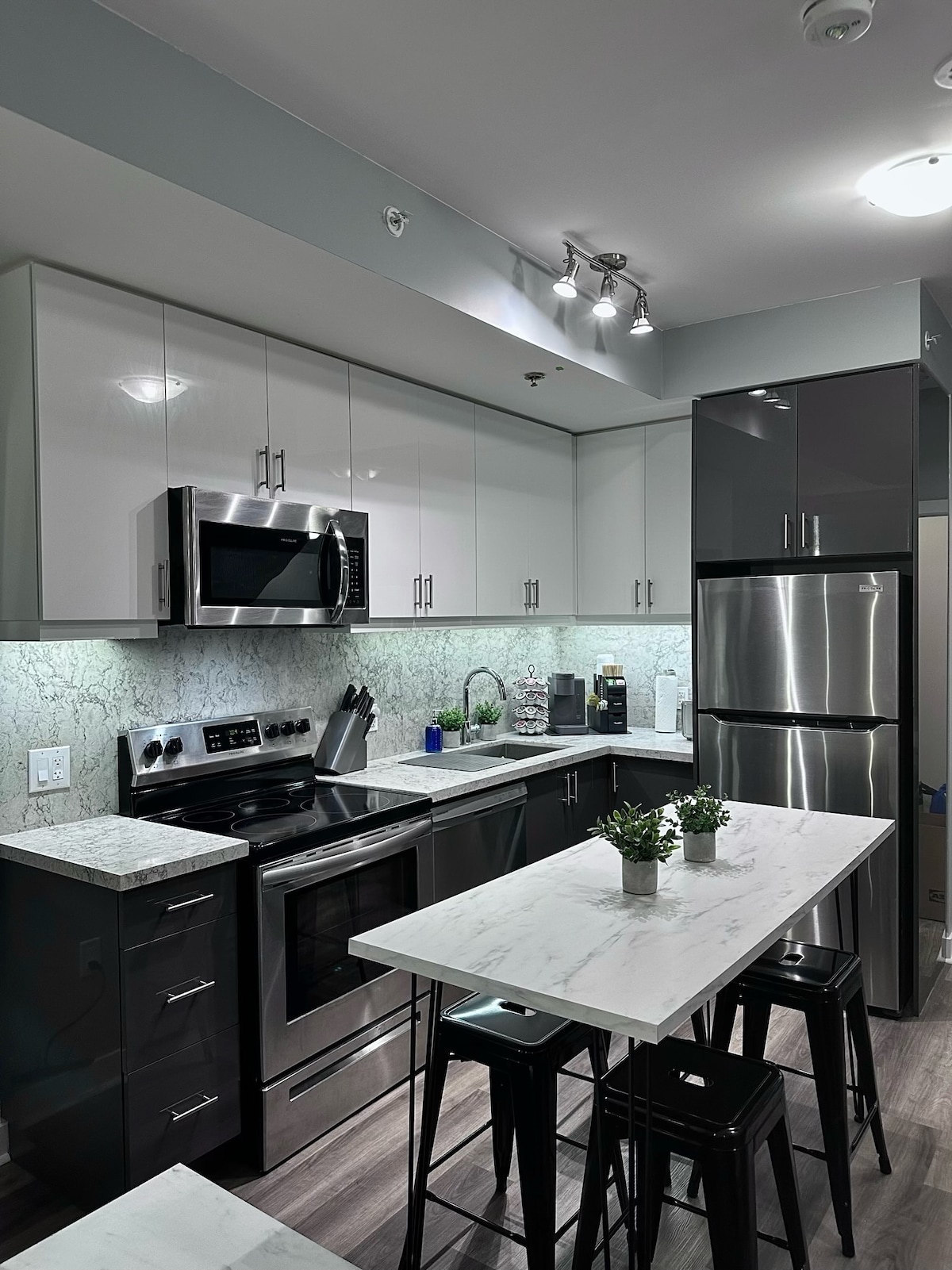 Clean Open Concept, Sun-Filled 2 Bedroom main floor home with PARKING; Can sleep up to 4 people. Featuring simple modern décor, queen size beds, big beautiful windows with room darkening curtains, closet storage. Dedicated office desks in bedrooms Full kitchen, with oil, seasoning spices, toaster, hot water kettle, Keurig Coffee Machine and complimentary coffee+tea. Clean bathroom with shampoo+conditioner+body wash+lotion SMART TV 60” Fast internet Wifi Check-In: 3PM Check-Out: 11AM