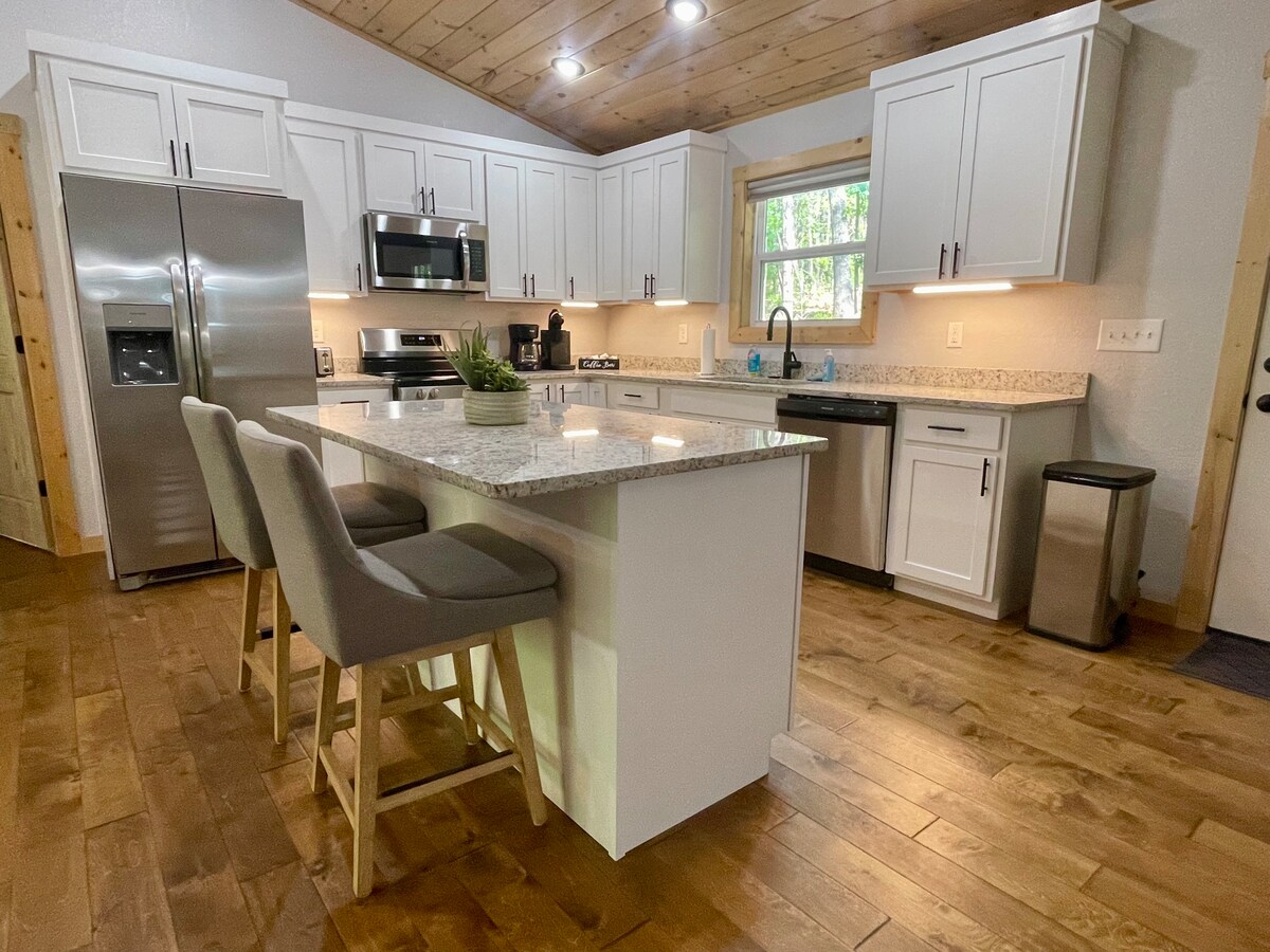 Piękny, prywatny i odnowiony domek w kształcie litery A nad strumieniem! Ciesz się nowoczesnym wystrojem rancza i kojącymi dźwiękami płynącej wody z przedniego pokładu podczas łowienia pstrągów! Zupełnie nowy taras nad strumieniem i miejsce na ognisko zapewniają niesamowite wrażenia w otoczeniu przyrody. Wnętrze jest komfortowe i przytulne, z dużymi oknami, które pozwalają na dużo naturalnego światła i widoki na las. To idealne miejsce, aby ponownie połączyć się z naturą i znaleźć spokój!