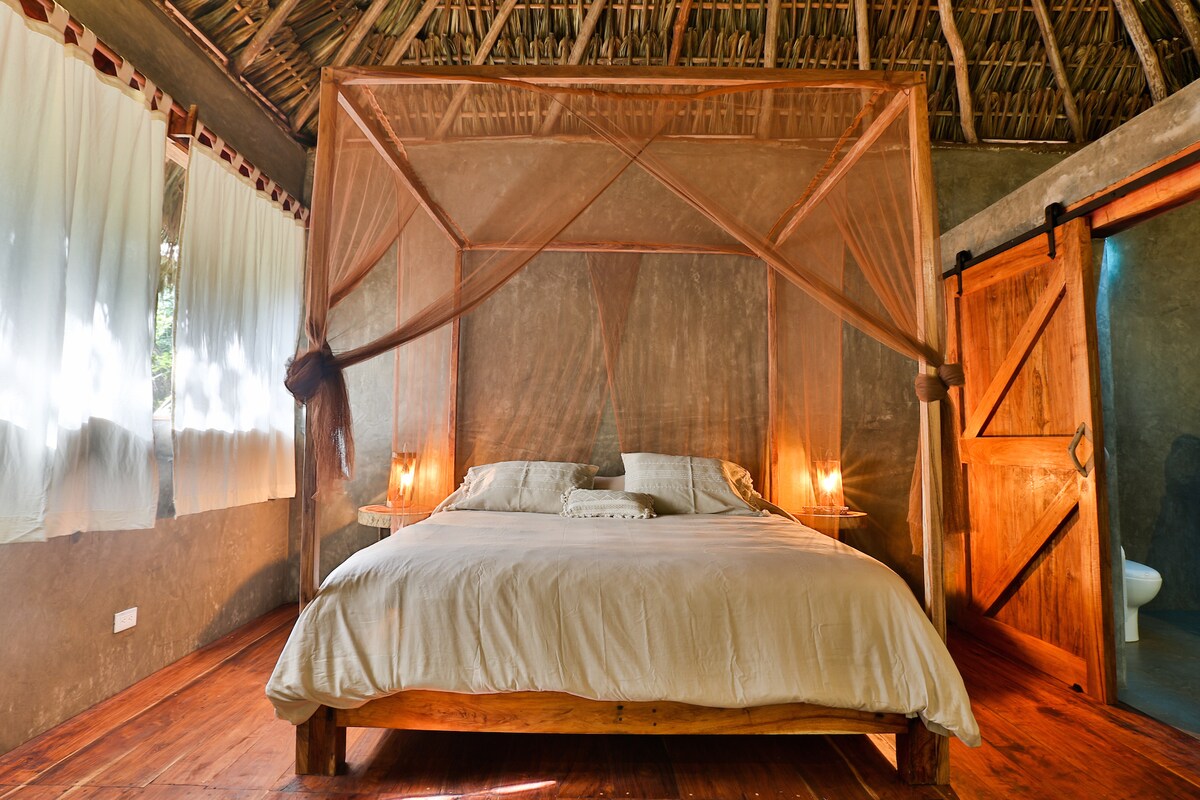 Ta chatka została zaprojektowana dla Ciebie, aby cieszyć się bliskością natury, zachowując jednocześnie komfortowe duże łóżko, jacuzzi, w pełni wyposażoną kuchnię i niesamowite widoki. Miejsce to zostało ozdobione prostymi i smakowitymi detalami, które pozwolą Ci zanurzyć się w naturze i poczuć przytulność domu. Masz przenośny kominek do rozpalania ogniska w zaciszu swojej chatki. Jesteś wystarczająco blisko, aby cieszyć się pięknymi plażami Tulum, a jednocześnie cieszyć się spokojem dżungli.