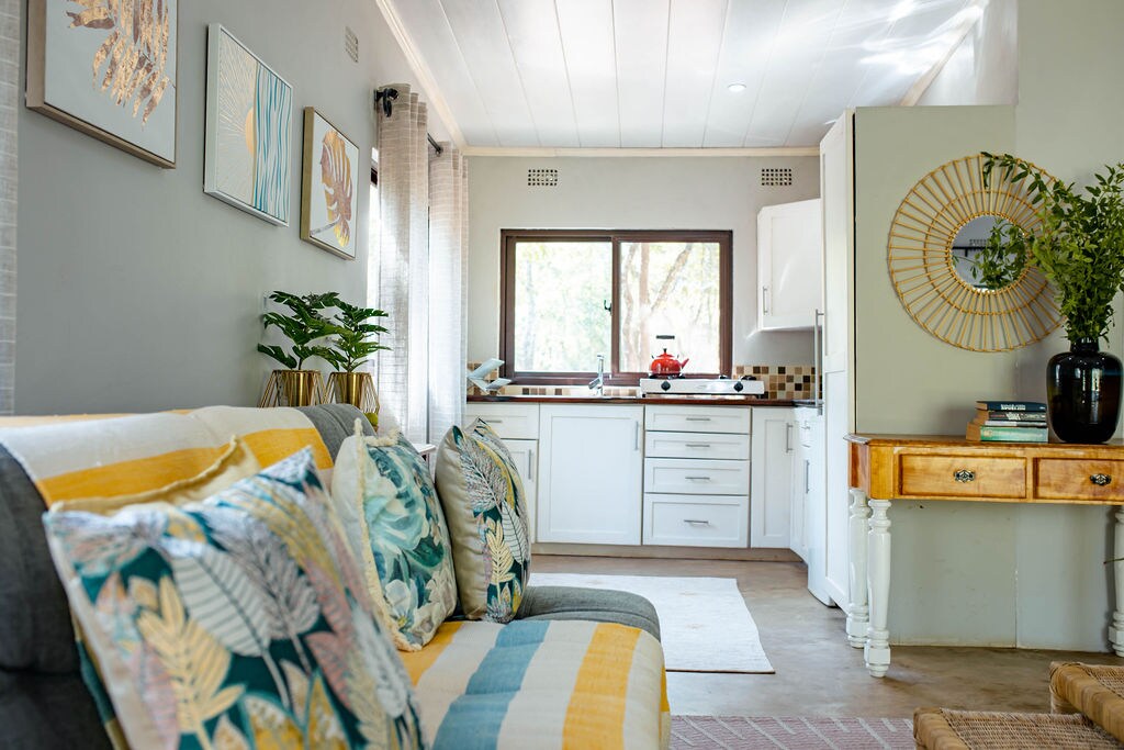 Przytulna opiekunka do łóżka na podwórku z głównym domem, łóżkiem typu queen-size, kanapą sypialną, szafą i klimatyzacją. Prysznic, toaleta, kuchnia z lodówką, kuchenką mikrofalową, kuchenką gazową. Stół roboczy/stół do jadalni i telewizor z WI-FI. Dostępny basen i szopa z krzesłami zewnętrznymi. Piękne otoczenie z drzewami i kwiatami. Dostępne usługi sprzątania. Pranie i prasowanie za opłatą. Zasilanie elektryczne dostępne z energią słoneczną. Wi-Fi dostępne, gdy ładowanie jest włączone.