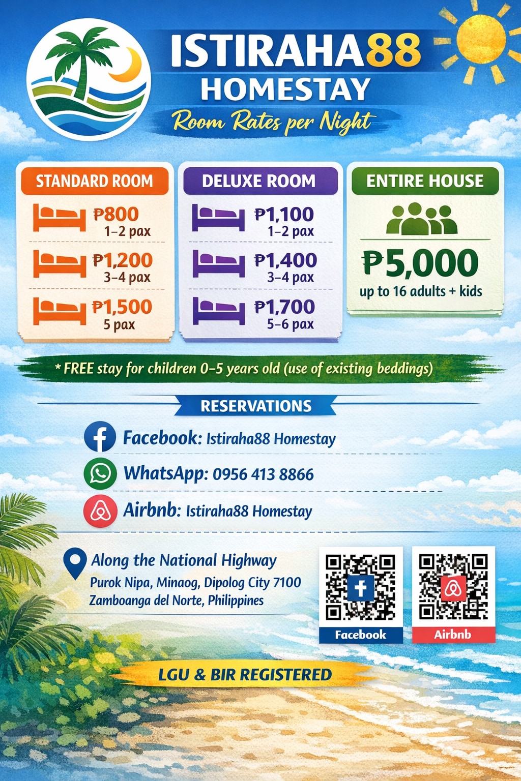 🌴 Cozy & Convenient Stay in Dipolog 🌴 Relax at Istiraha88 Homestay, your comfortable home along the National Highway in Minaog, Dipolog City. Enjoy air-conditioned rooms, fast WiFi, a fully equipped kitchen, and a peaceful atmosphere perfect for families or groups. With easy access to nearby attractions and essentials, it’s the ideal place for both short and long stays.