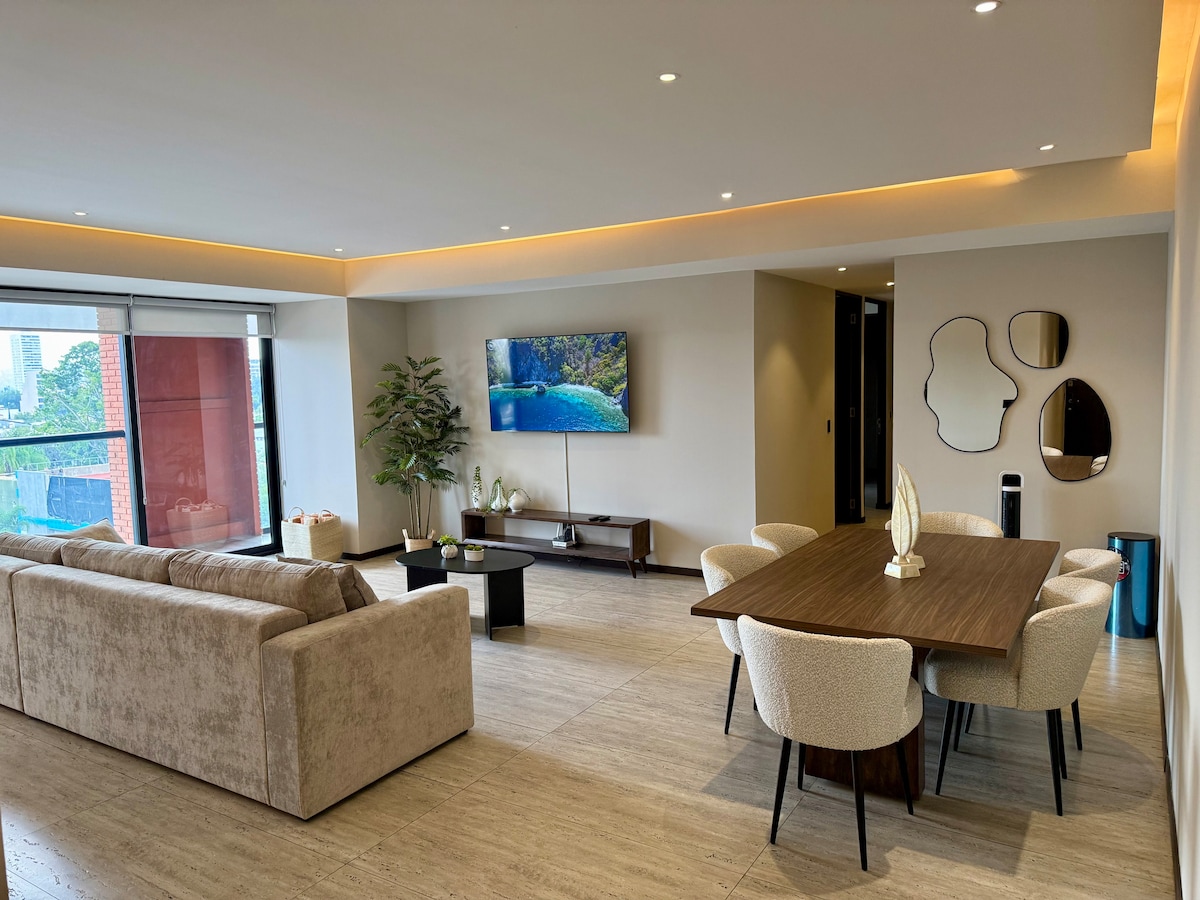 Luksusowe mieszkanie w Guadalajarze, urządzone przez biuro FNisino i z meblami wykonanymi na zamówienie przez lokalnych rzemieślników. Zatrzymaj się w jednym z najbardziej ekskluzywnych i nowych budynków w Providencia, w pobliżu strefy finansowej, lasu Colomos, Punto Sao Paulo i zaledwie 10 minut od Andares. Wyjątkowo komfortowe miejsce, które ma wszystkie udogodnienia i zapewni Ci niesamowity pobyt. Ma całodobową ochronę, basen, siłownię, coworking i własny parking.