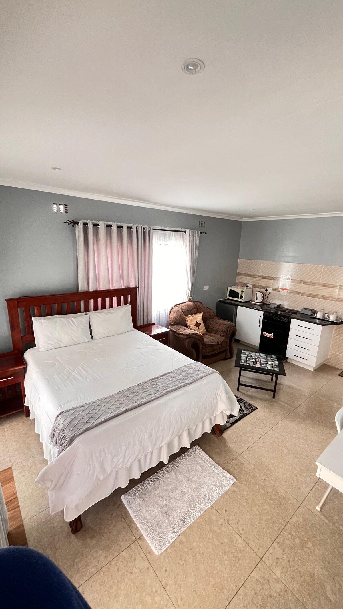 Situated about 5km from the city centre, this newly refurbished 1 bedroomed self contained apartment is located in a quiet area of Burnside. Razor wire and remote control for gate. This comes with free parking, private wi-fi, fully equipped kitchen, flat screen TV , backup solar system, geyser and borehole.. About 3 km from the guest house are the famous Hillside dams and 25km from the World's View, Matobo National Park popularly known for the Matobo Hills, balancing rocks and many more.