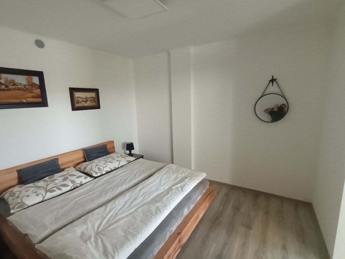 Witamy w nowoczesnym apartamencie w Znojmo. Z 6. piętra rozciąga się piękny widok na miasto. Apartament o powierzchni 52 m² składa się z dwóch pokoi: salonu z telewizorem, biurkiem i rozkładaną sofą (190x120) oraz oddzielnej sypialni z łóżkiem (200x180). Kuchnia wyposażona jest w urządzenia, sprzęt, bar i ekspres do kawy. Jest łazienka z prysznicem i oddzielna toaleta. Sypialnia jest klimatyzowana, a w salonie jest wentylacja. Wskazówki dotyczące wycieczek: historyczne centrum Znojmo, Vranov nad Dyjí, NP Thaya.