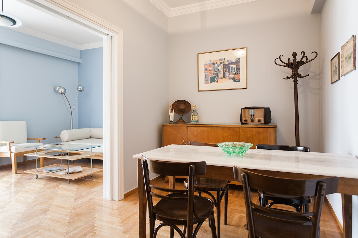 Atrakcyjne mieszkanie w stylu retro z lat 50. XX wieku na najwyższym piętrze, 2,5 km od Akropolu i zaledwie 2 minuty spacerem od stacji metra Megaro Mousikis. Mieszkanie zostało w pełni odnowione w 2017 roku i posiada: - Klimatyzacja w sypialni i salonie – Duży balkon główny z roślinami (świetne miejsce, by rozkoszować się kieliszkiem wina!) – Szybkie Wi-Fi - Sypialnia (balkon) - Nowoczesna kuchnia (balkon) - Nowoczesna łazienka - Przestronny salon (z dużą pojedynczą rozkładaną sofą)
