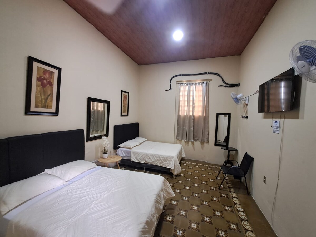 Hospedaje en habitación privada, con todas las comodidades necesarias, a tan solo una cuadra del parque central de la ciudad. Nuestro espacio incluye amplias habitaciones con capacidades desde 1 a 6 personas; ofreciéndote baño privado, espacios de trabajo, aire acondicionado, tv con cable, parqueo privado y con un área de descanso al aire libre donde podrás disfrutar al máximo tu estadía.