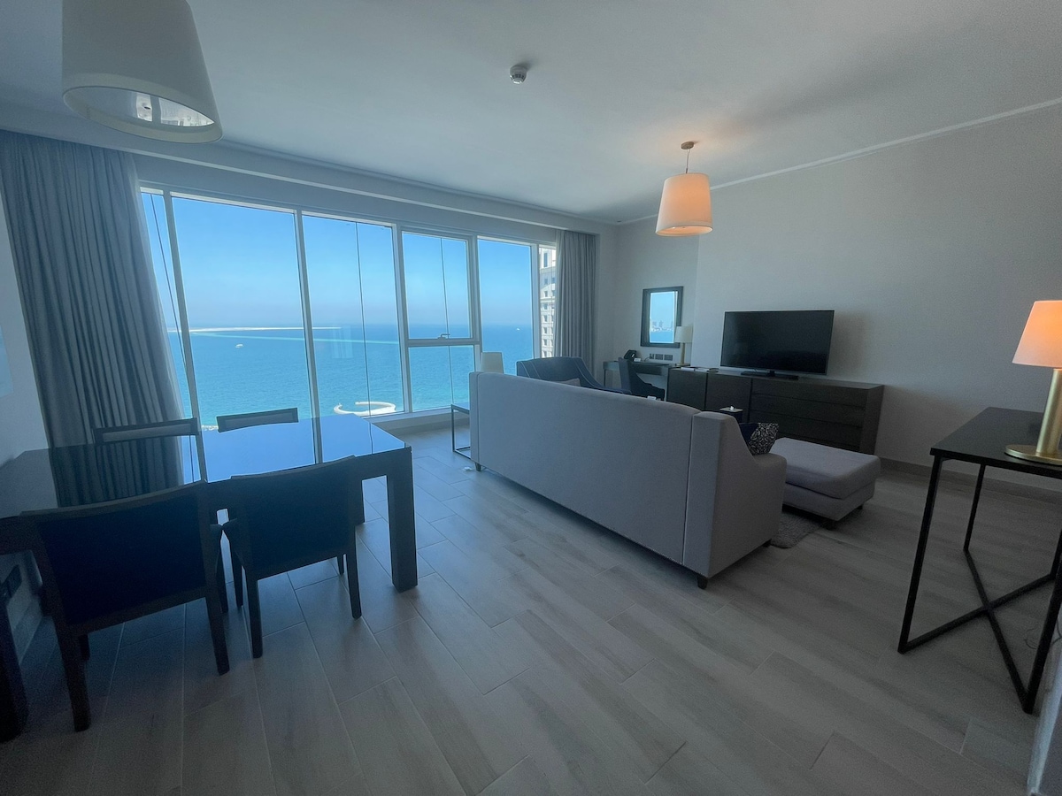 Full sea views meet city convenience in this 1BR at West Bay Residence . Unwind in a calm, hotel-standard space with a king bed, fast Wi-Fi, smart TV and a ready-to-cook kitchen. Access pool & gym, 24/7 reception and secure parking. Steps from the Corniche and City Center Mall—perfect for business travelers, couples and weekend escapes.
