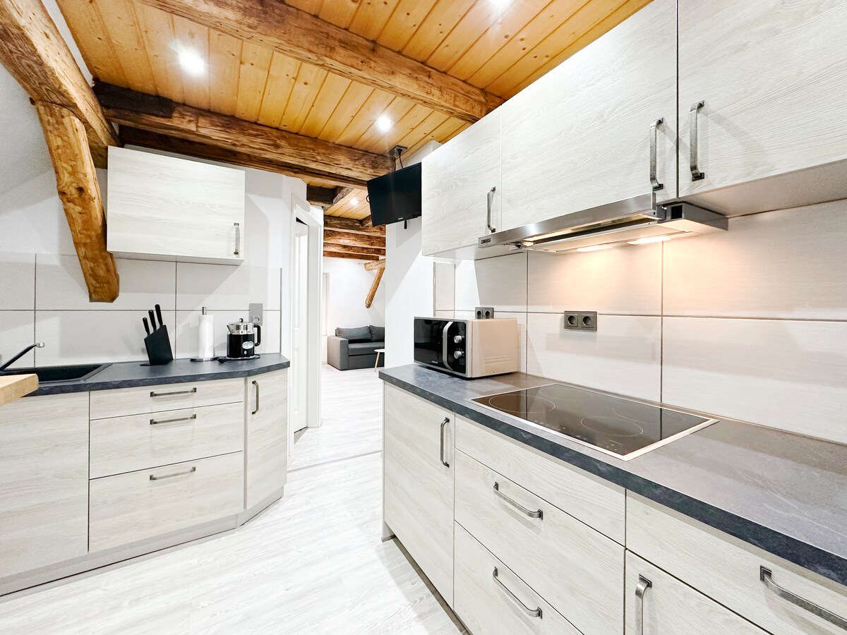 The highlights of the apartment are a spacious living room with a double bed under the roof (access via a ladder) and an open kitchen-living room. Bed linen and towels as well as basic equipment (toilet paper, dishes and spices) are available. The cozy barbecue area, including charcoal, can be used for cozy hours. We will take care of cleaning the grill. Please note that if you book an overnight stay (1 day) we will add an additional €10 to the total price.